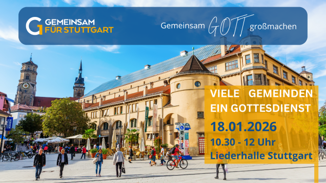 Auch dieses Jahr gibt es einen gemeinsamen Gottesdienst der Stuttgarter Gemeinden. Weitere Infos findest gibt es auf der Veranstaltungshomepage: https://gemeinsam-fuer-stuttgart.de/gemeinsam-gott-grossmachen