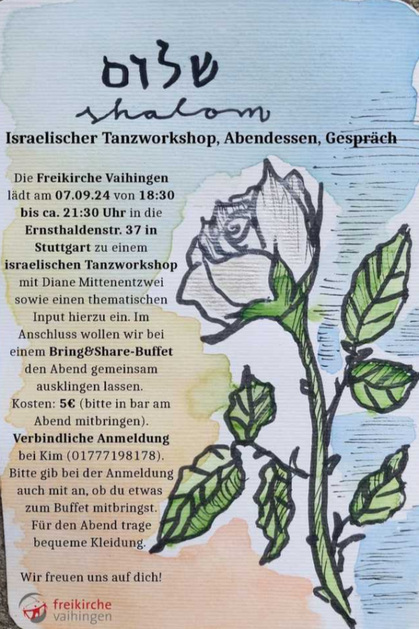 Am 07.09.24 haben wir einen Abend zum Thema "Shalom" veranstaltet: 22 Frauen und 1 Mann hatten die Möglichkeit bei einem Tanzworkshop mit Diane Mittenentzwei israelischen Tanz kennenzulernen. In